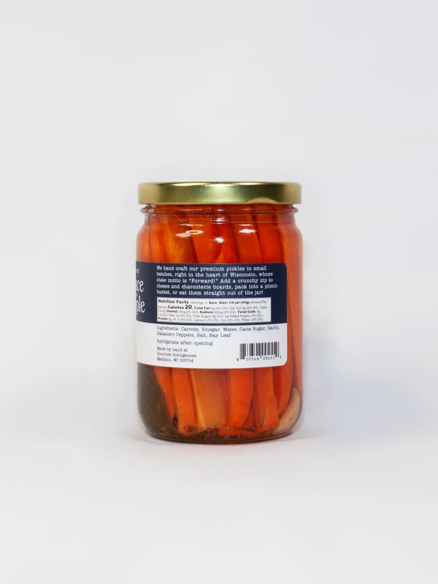 These carrots are a little bit sweet with a good dose of habanero heat. Flavored with garlic and bay leaf, these pickles add a spicy punch to anything from cheese boards to bloody marys. They're also great for snacking right out of the jar.