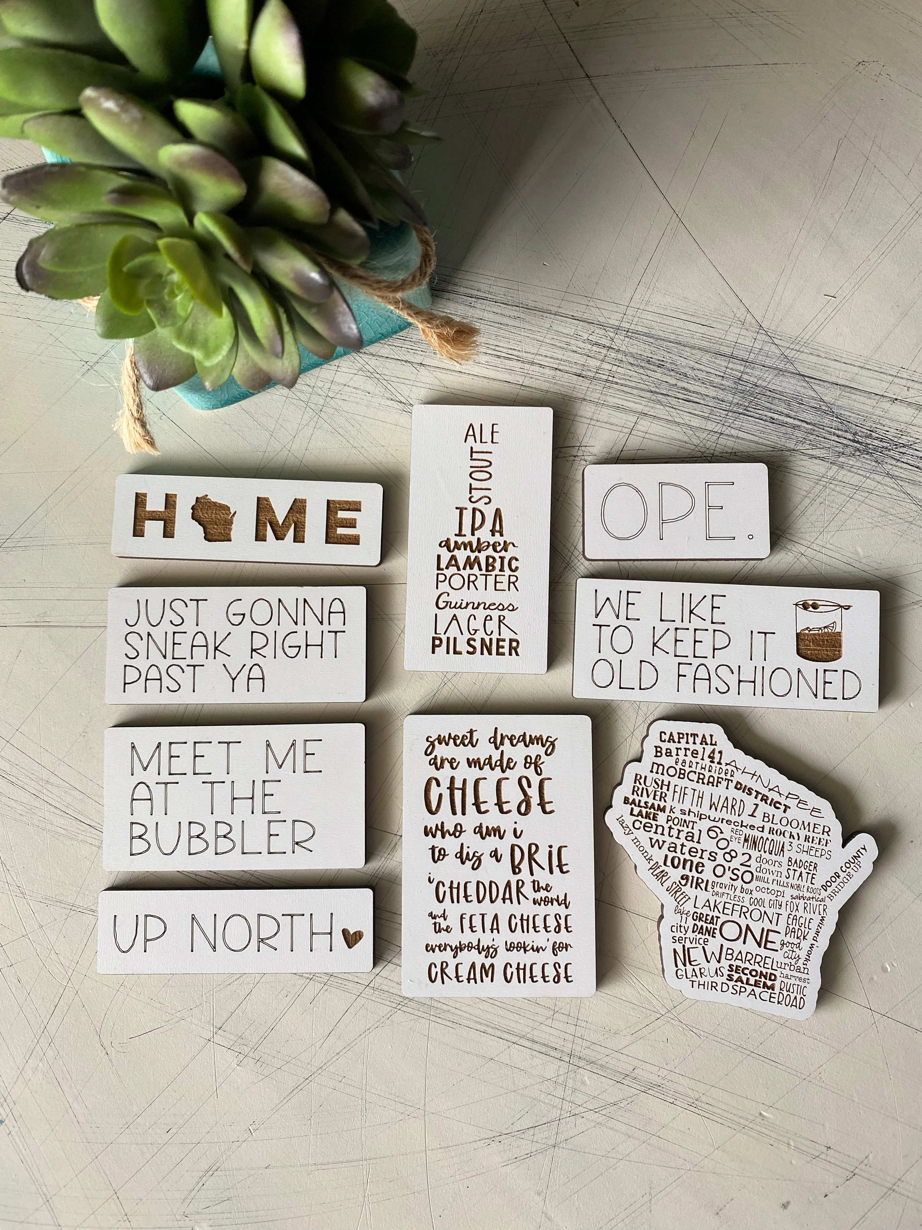 Set includes: ope; meet me at the bubbler; just gonna sneak right past ya; we like to keep it old fashioned; up north; home; sweet dreams are made of cheese; and my original designs of beer names in the shape of a beer bottle and WI craft breweries in the shape of Wisconsin.